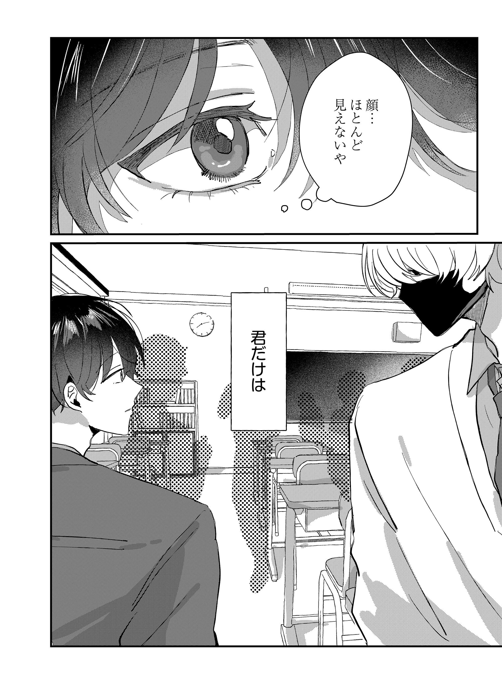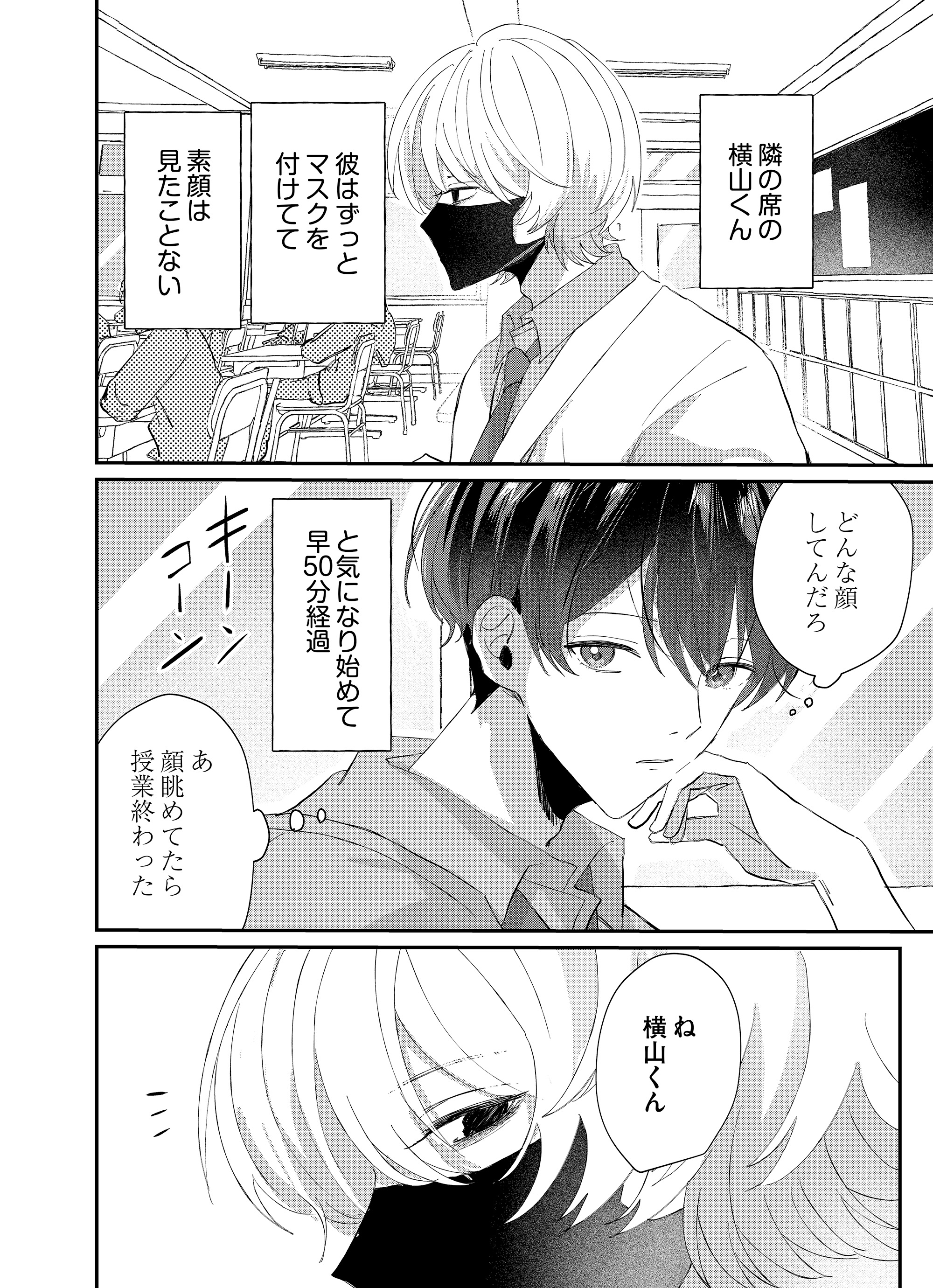 転校してきたばかりの立川颯斗(たちかわはやと)は、隣の席のクラスメイト・横山湊(よこやまみなと)に夢中。横山くんはずっとマスクをしていて、前髪で顔がほとんど見えない。「どんな顔してんだろ…」と思っていた矢先に、なんとマスクの下の素顔を目撃してしまい……!?気づけば頭の中は横山くんでいっぱいで、どんどん沼にハマっていく!