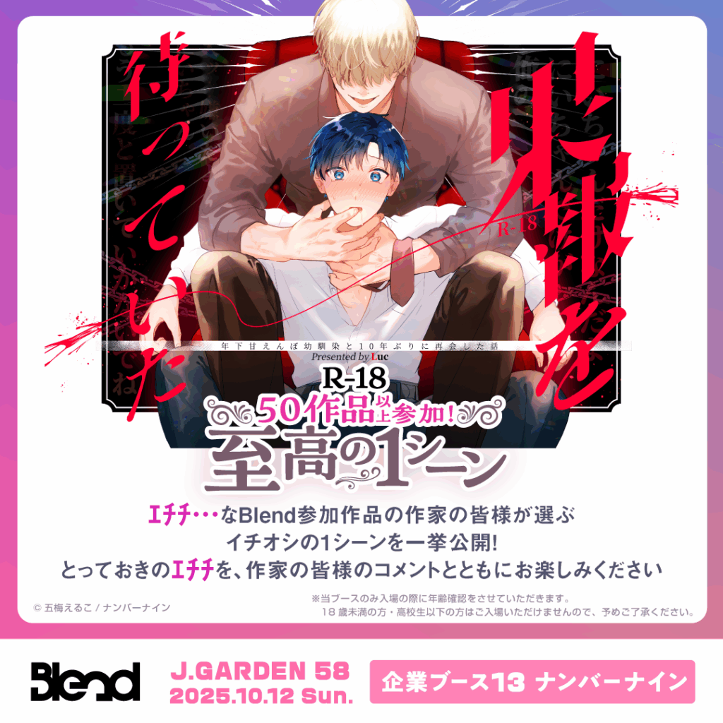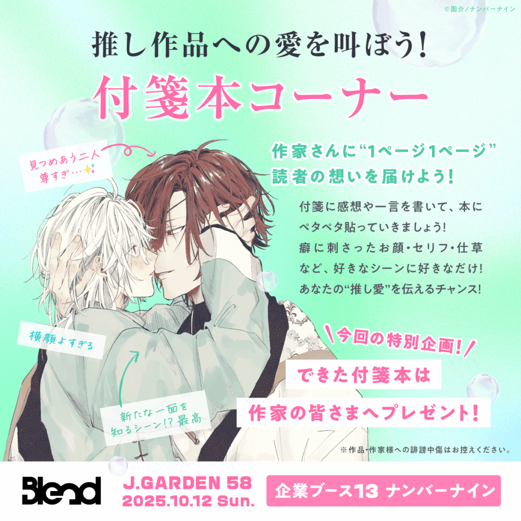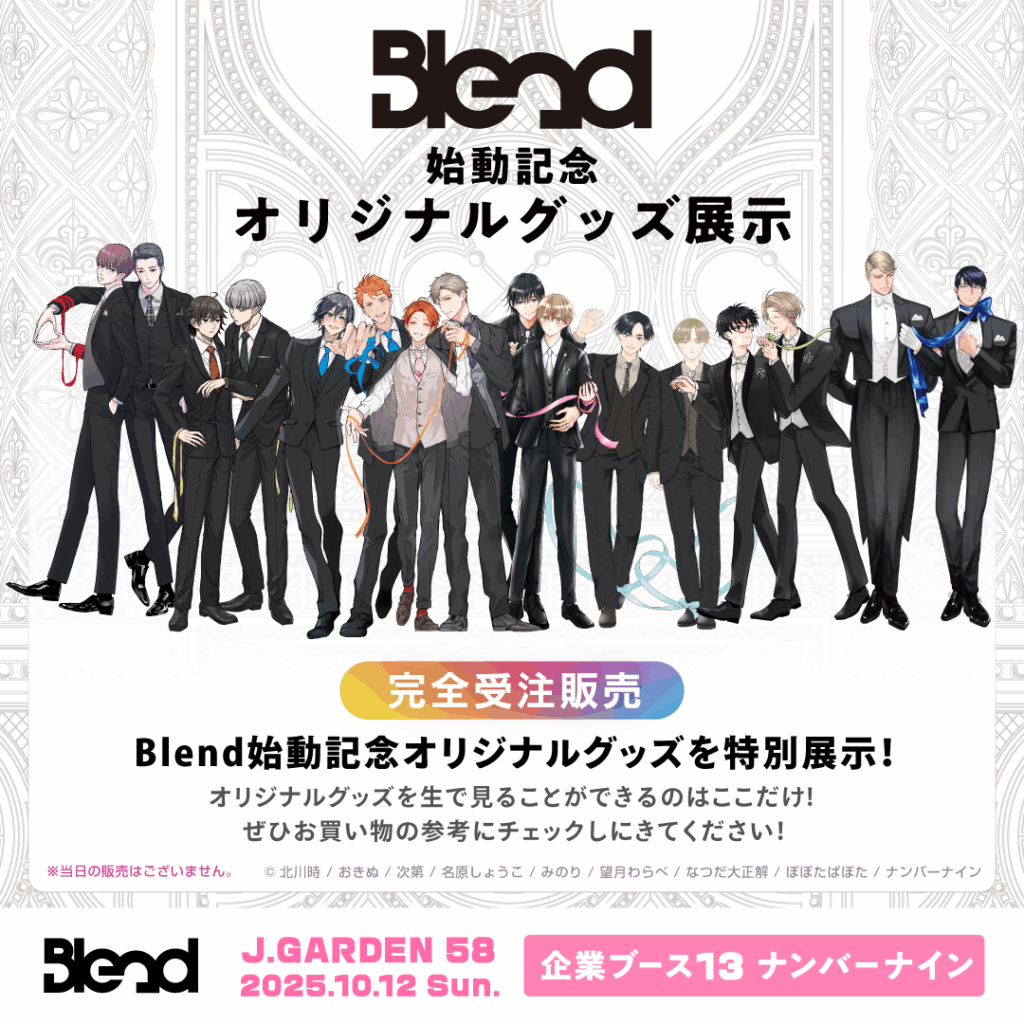 この度、2025年10月12日(日)に東京ビッグサイトで開催される「J.GARDEN58」に、BL漫画プロデュースブランド「Blend」、商業BLレーベル「N.Blend」、そして現在開催中のBLファンの”好き”が見つかる創作BLオンリーイベント「創作BL大豊作まつり」による大規模ブースの出展が決定いたしました!