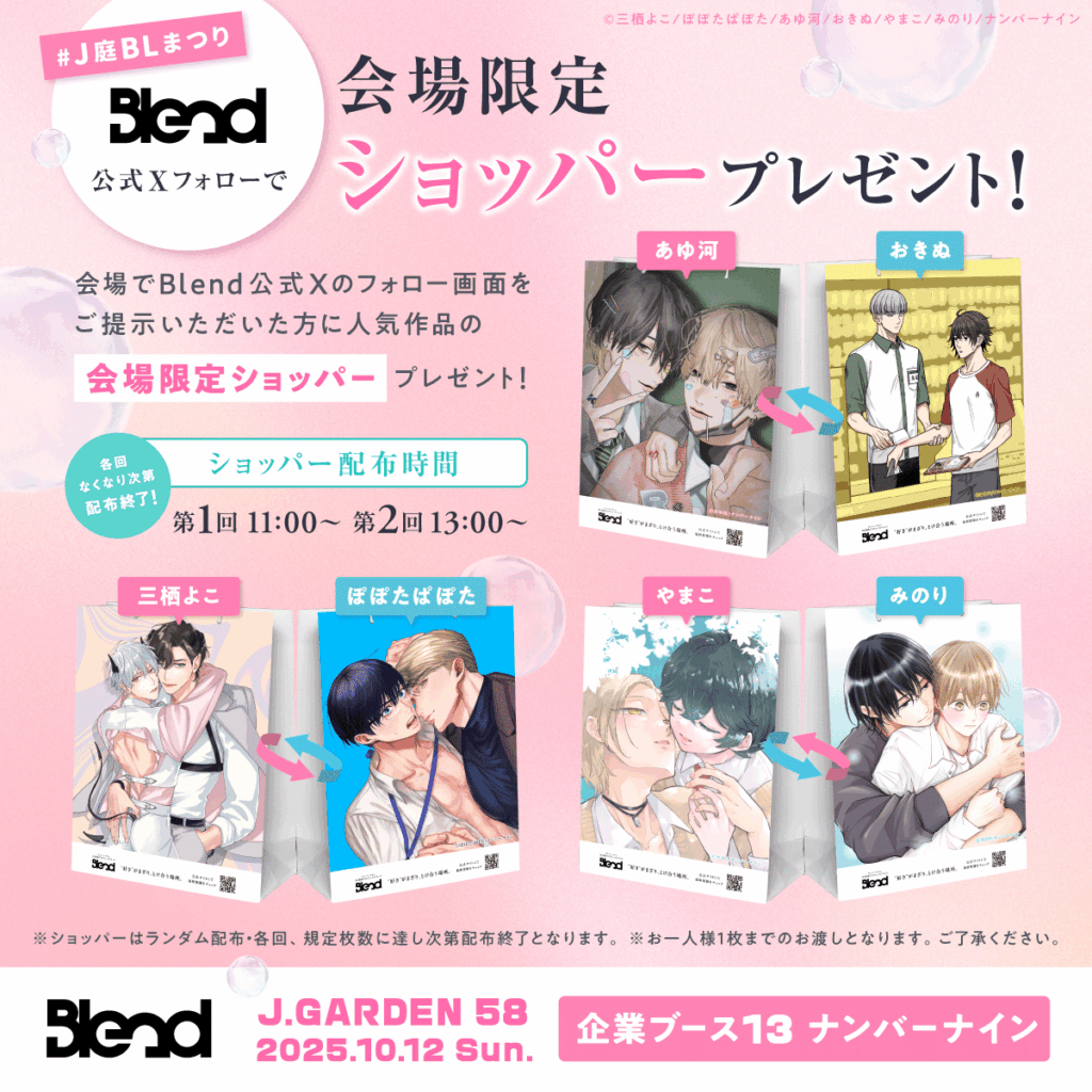 Blend 公式Xアカウント(@Blend_no9)のフォロー画面をご提示いただいた方に、人気作品の会場限定ショッパーをプレゼントいたします!配布時間は11時と13時と二回に分けて限定配布いたします!