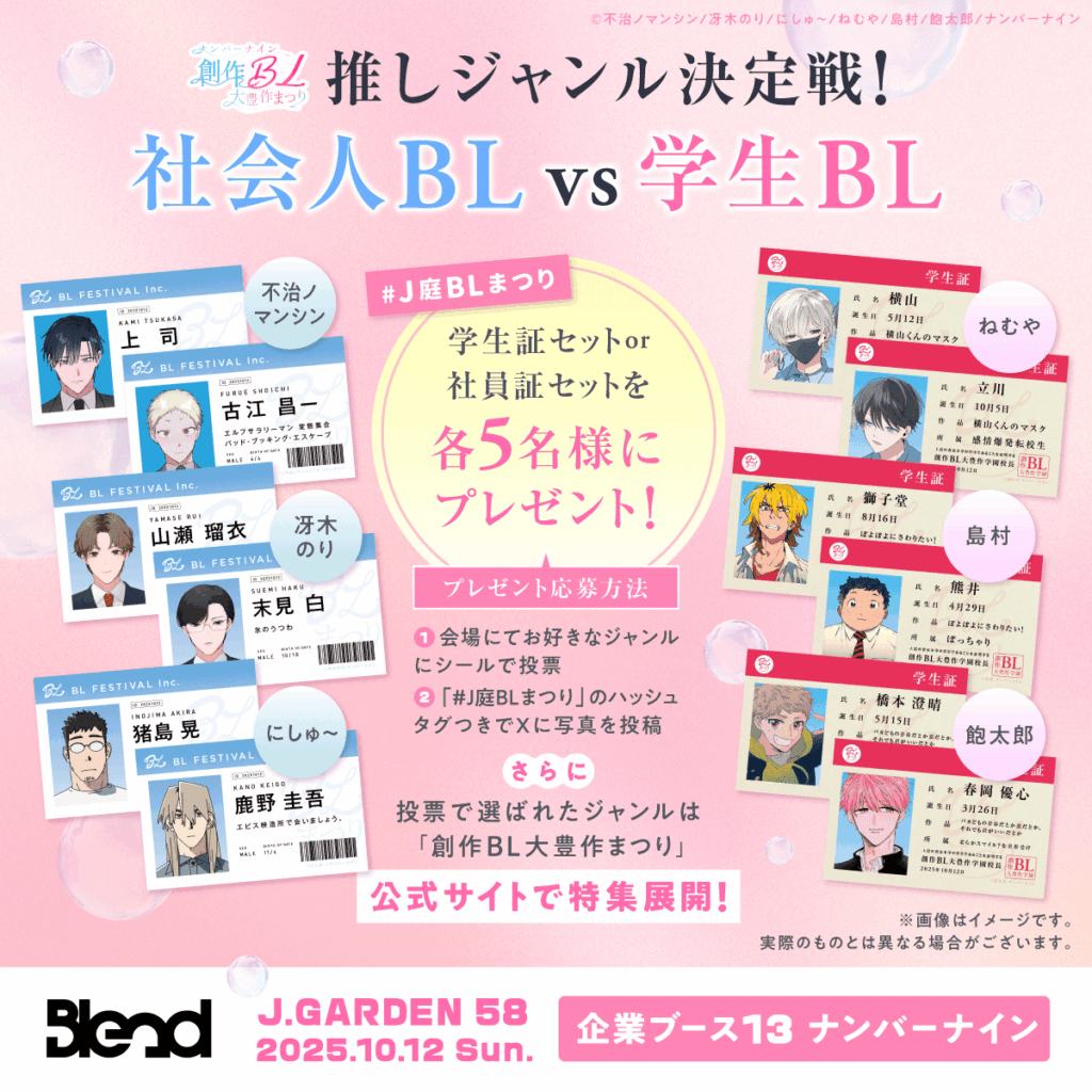 ブースにてご用意しているシールで投票して、創作BL大豊作まつりXアカウント(@no9blfes)をフォロー& 「#J庭BLまつり」と一緒にXに写真を投稿すると、人気作品の学生証セット・社員証セットを各5名様にプレゼント!