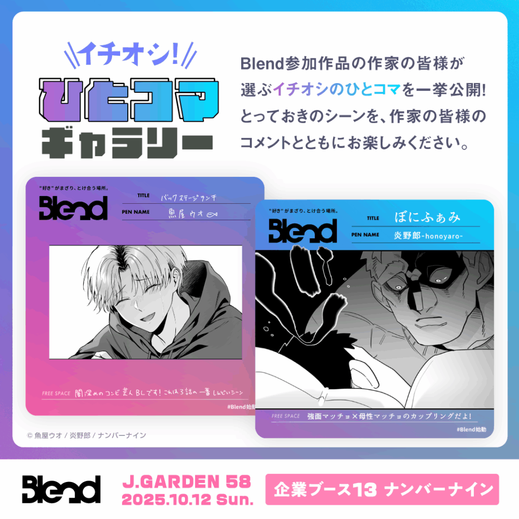 この度、2025年10月12日(日)に東京ビッグサイトで開催される「J.GARDEN58」に、BL漫画プロデュースブランド「Blend」、商業BLレーベル「N.Blend」、そして現在開催中のBLファンの”好き”が見つかる創作BLオンリーイベント「創作BL大豊作まつり」による大規模ブースの出展が決定いたしました!