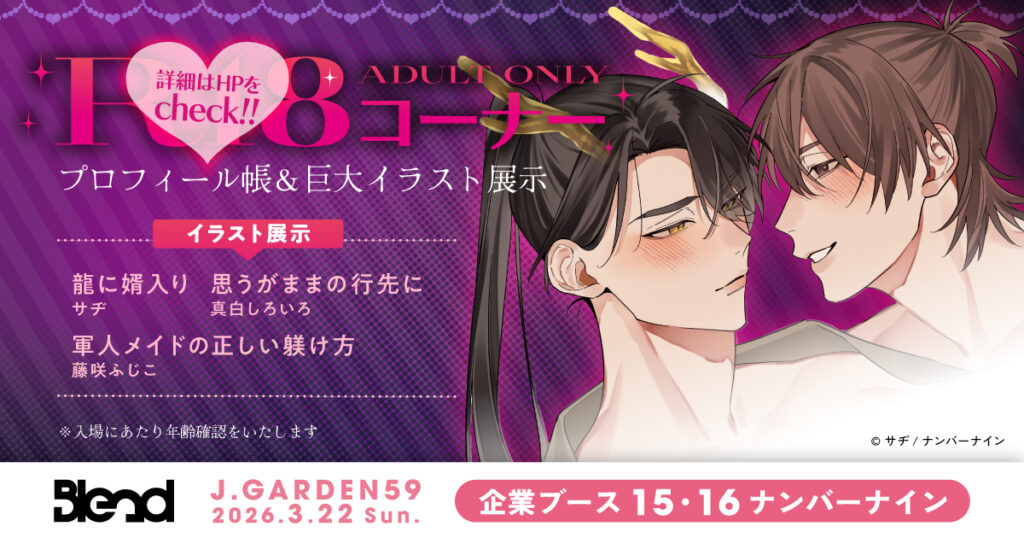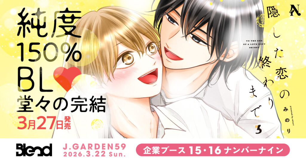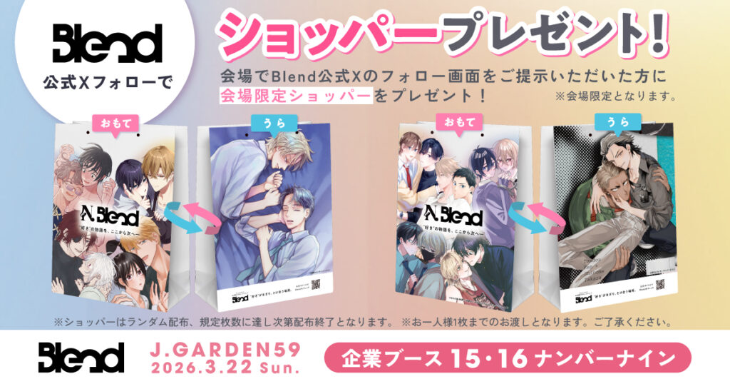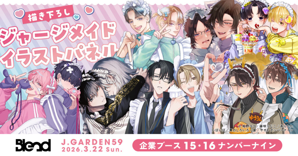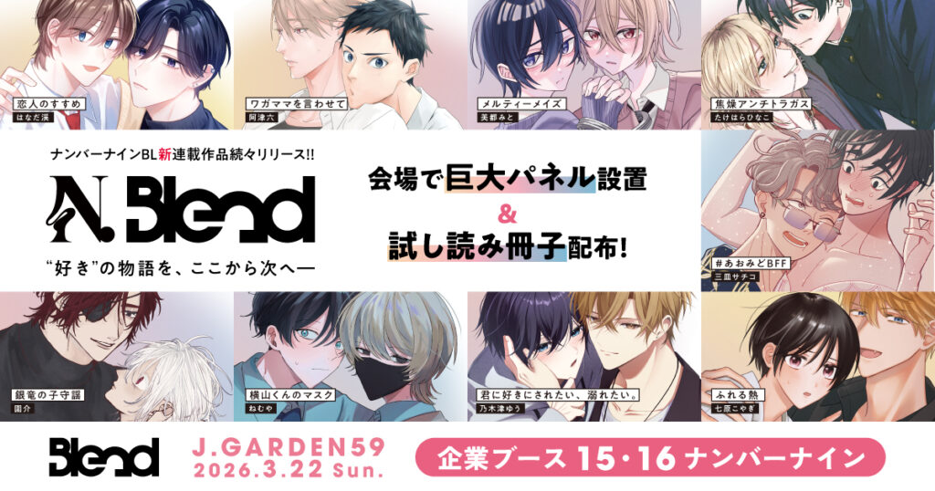 2026年3月22日(日)、東京ビッグサイトで開催される「J.GARDEN59」に、ナンバーナインによる商業BLレーベル「N.Blend」、紙書籍レーベル「Blend comics」、BL漫画プロデュースブランド「Blend」、創作BLオンリーイベント「創作BL大豊作まつり」による大規模ブースの出展が決定いたしました!