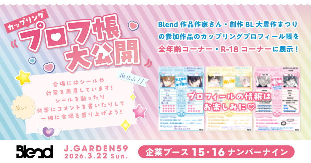 3月22日(日)開催「J.GARDEN59」に「N.Blend」「Blend comics」「Blend」「創作BL大豊作まつり」大規模ブース出展!