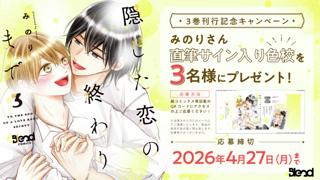『隠した恋の終わりまで』3巻刊行記念キャンペーンとして、『隠した恋の終わりまで』3巻を紙書籍でご購入の方の中から、3名にみのりさんの直筆サイン入り色校をプレゼントします。